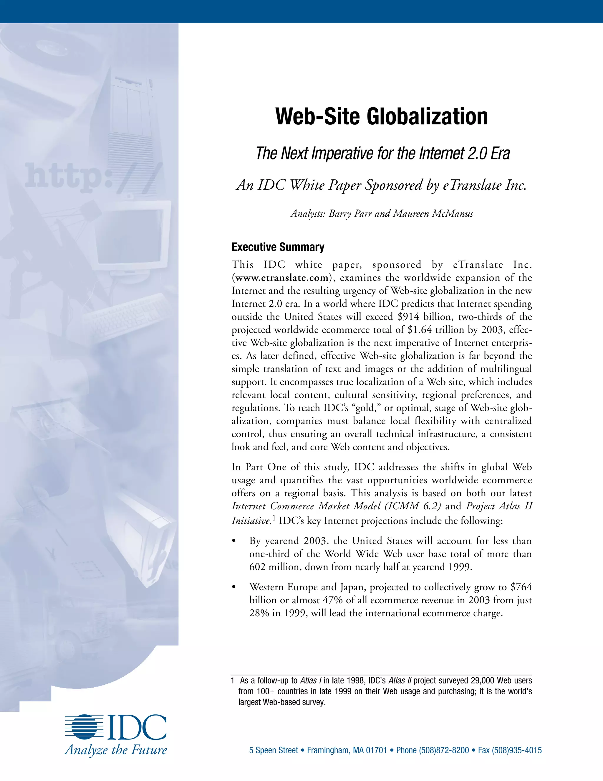 This IDC white paper emphasizes the crucial need for website globalization in the Internet 2.0 era as global e-commerce is set to surpass $1.64 trillion, with significant growth expected outside the U.S. Effective globalization involves more than translation; it requires cultural localization and responsive strategies to accommodate international markets. The paper argues that U.S. companies must act swiftly to avoid losing opportunities in the expanding global web landscape, where their dominance is rapidly diminishing.