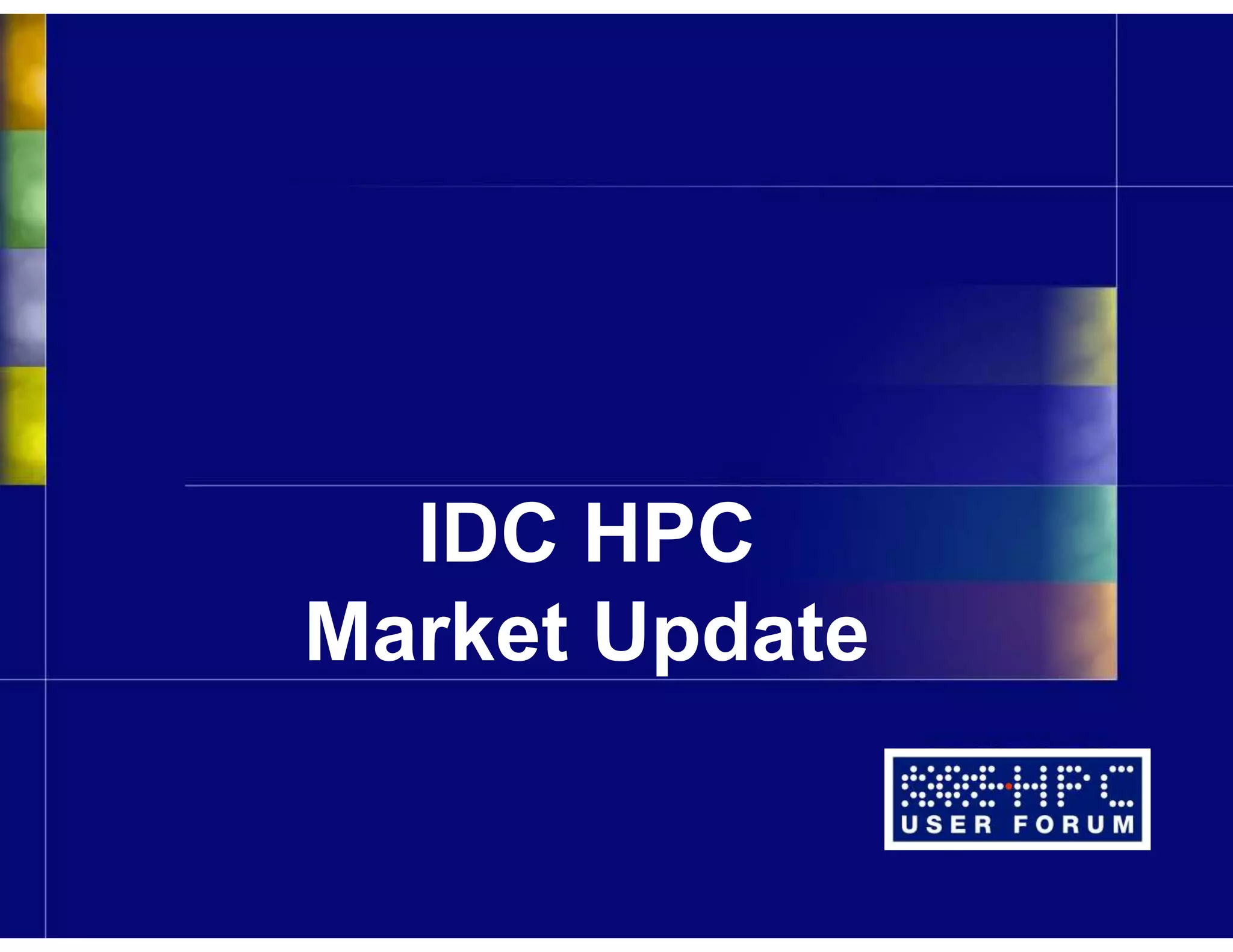 The IDC HPC Market Update outlines the status and trends in the high-performance computing (HPC) market, revealing a total market value of $11.4 billion in 2015 with anticipated growth of 7.7% annually through 2019. It identifies key trends, including an increase in big data applications, government investment in HPC for economic competitiveness, and a strong emphasis on HPC storage as the fastest-growing segment. Additionally, the document details new workload segments driven by high-performance data analytics and highlights the strategic importance of HPC across various industries.
