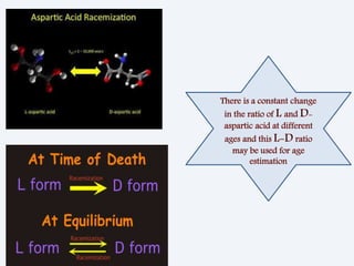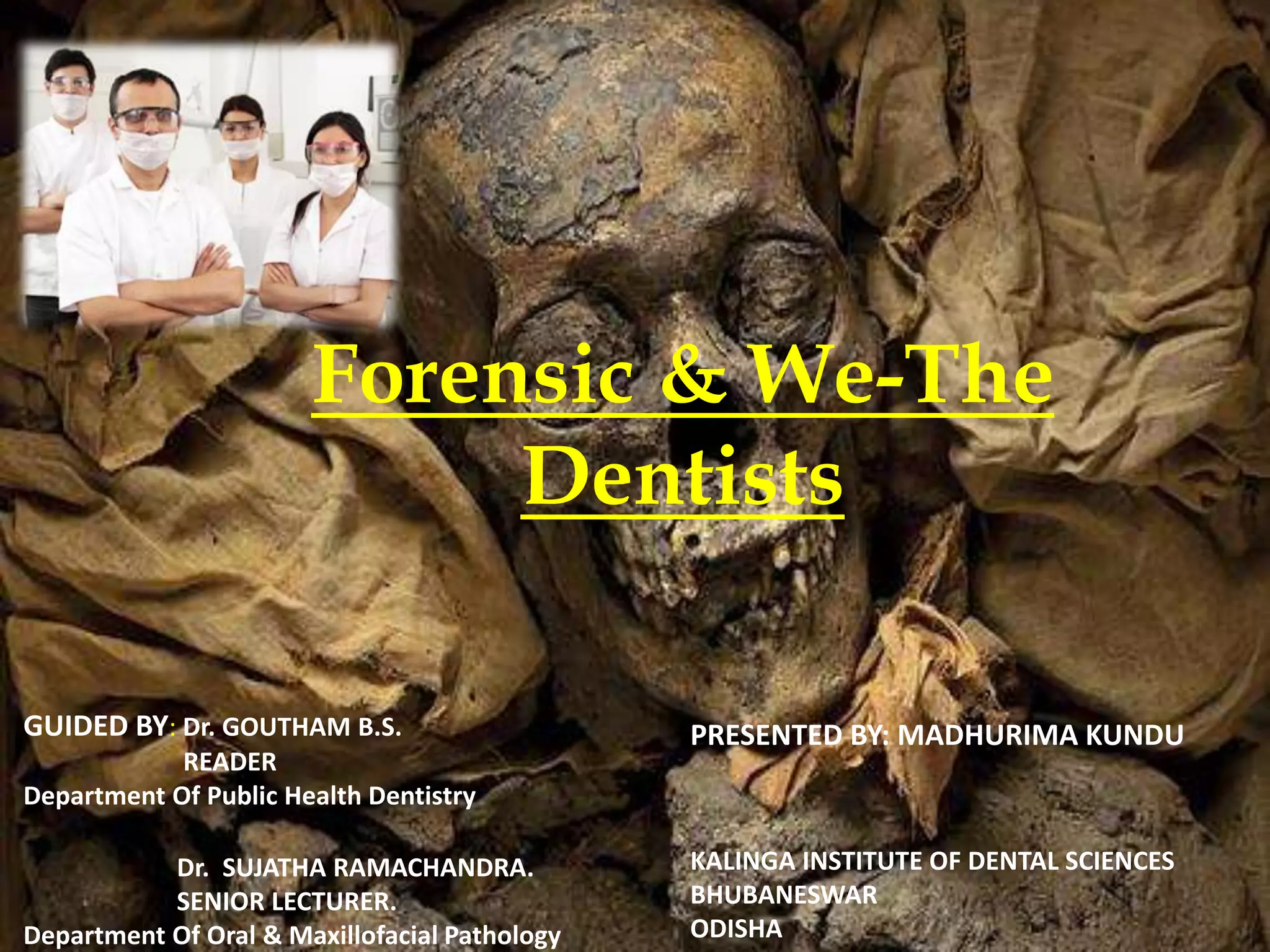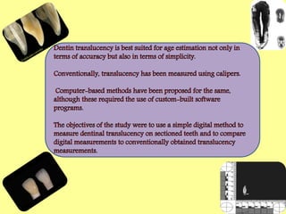 The document discusses forensic odontology, which is a branch of dentistry focused on the examination and evaluation of dental evidence for justice. It highlights the historical development of the field, beginning with Dr. Paul Revere, and outlines various aspects of dental remains such as enamel, dentin, pulp, and cementum in relation to age estimation and identification. The document emphasizes the importance of dental records in identifying living and deceased individuals and suggests increasing awareness and social responsibility among dental practitioners in India.