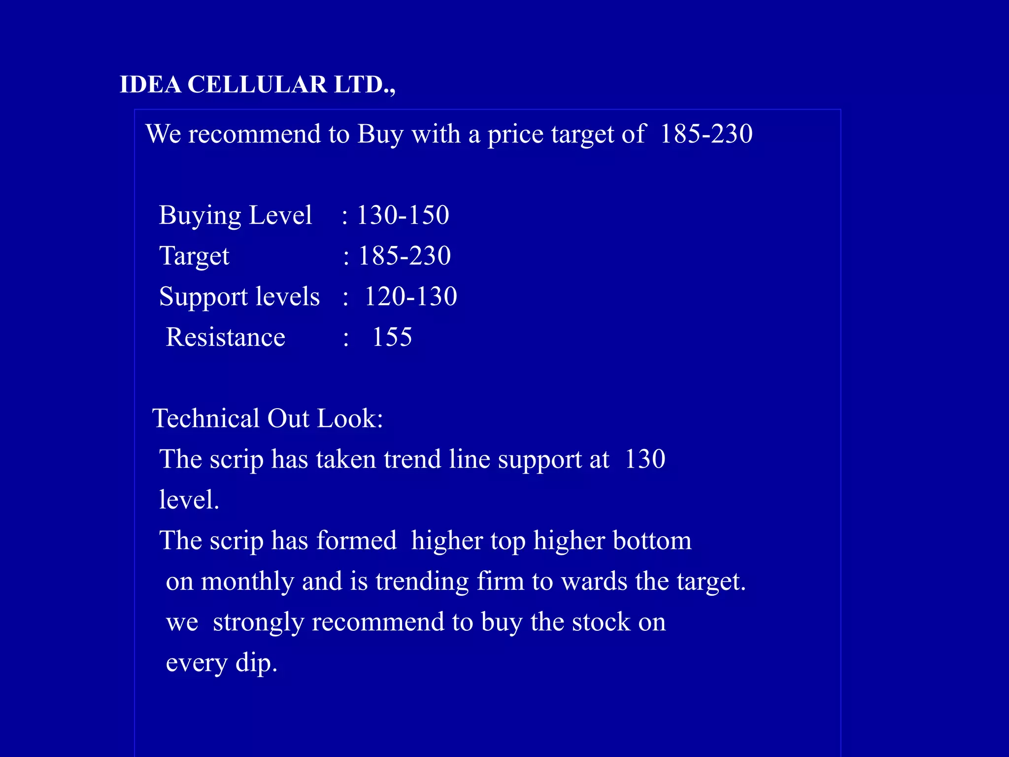 Idea Cellular Ltd. is recommended as a buy with a price target of Rs. 185-230. The technical outlook is positive as the stock has taken support at Rs. 130 and is trending higher. Company outlook is also positive due to expected robust subscriber growth, improving EBITDA margins, and potential value unlocking from hiving off its tower business. On the financial front, net sales increased 64% YoY while EBITDA and PAT grew 69% and 259% YoY respectively due to margin expansion and lower costs.