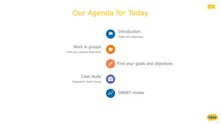 The document introduces advocacy concepts by emphasizing the importance of mission statements that define a group's identity and purpose. It presents a case study of the Stopwatch Youth Group, focusing on their goals to raise awareness about stop/search issues and engage youth in discussions. The document highlights the SMART criteria for setting effective objectives that are specific, measurable, achievable, relevant, and time-bound, along with group activities that align with their mission.