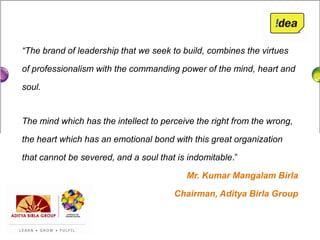 Idea's journey to becoming a leading telecom provider in India has been unique and uncommon in many aspects. [1] It began operations in 1997 in two service areas and grew through strategic acquisitions and mergers to become a pan-India provider by 2006. [2] It has experienced tremendous growth, with average four-year sales and profit growth of around 60% and 100% respectively between 2006-2010. [3] As of 2011, Idea served over 95 million customers across India, making it one of the largest mobile companies in the country.