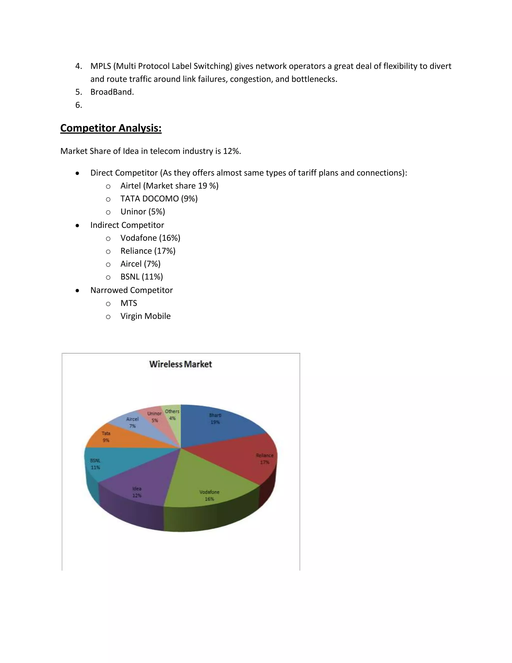 Idea Cellular is the 4th largest wireless carrier in India with 100 million customers and a 12% market share, though it faces bargaining power from customers and suppliers due to competition from other carriers offering cheaper services. New entrants like 4G and substitute technologies also pose threats. Direct competitors with similar service offerings and significant market share include Airtel, Tata Docomo, and Uninor.