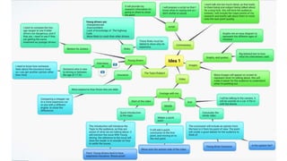 The document provides details on the development of ideas for a video on young drivers and car insurance. It includes concept boards with proposed color schemes, fonts, and imagery to incorporate themes of driving. The proposed structure is to introduce the topic, explain risks and insurance costs faced by young drivers, include primary research, and conclude with an opinion. Video and imagery will be used to explain points creatively through examples and diagrams related to road signs and cars. Background research techniques involve sticking to the driving theme, using both video and imagery, and concisely explaining topics.