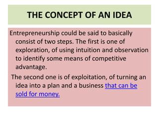 The document outlines the process of idea development and business planning for entrepreneurs, emphasizing two main steps: exploration and exploitation of ideas. It stresses the importance of identifying personal talents and passions to develop viable business ideas, as well as the need for testing these ideas against market demand. Furthermore, it discusses understanding competition and customer psychology as crucial elements for entrepreneurial success.