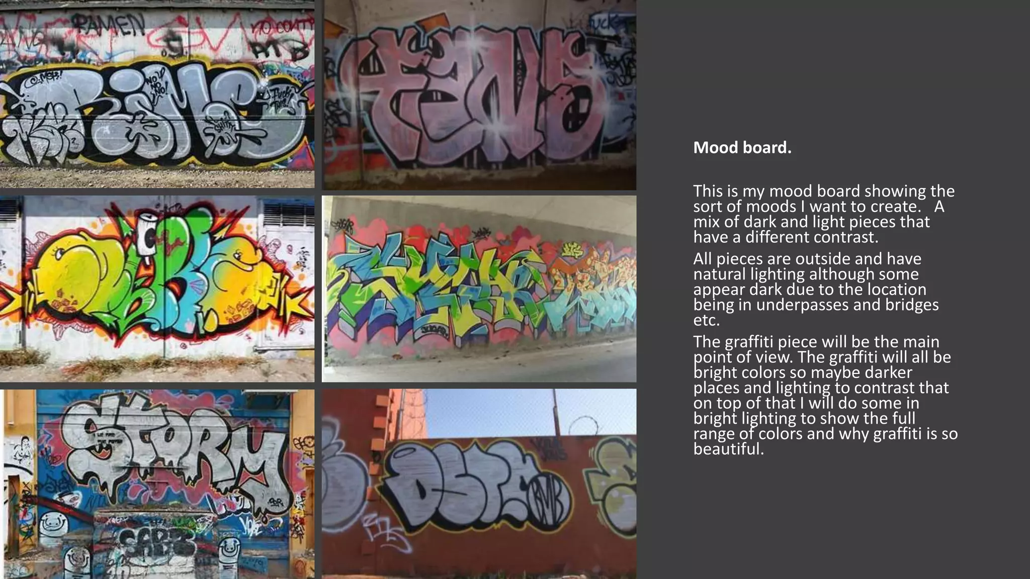 The interviewee discusses different types of graffiti including tags, throw ups, wild style, blockbuster, semi-wild style, stencil, sticker, poster, and heaven spots. They provide examples of each type and explain the key differences. The goal is to educate viewers about graffiti styles for a documentary. Further experiments are planned to improve interview questions and audio quality.