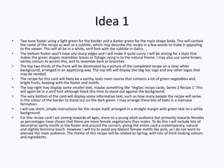 The final recipe card idea incorporates elements from two initial concepts - a natural spring theme focusing on green vegetables and brightly colored fruits, and the suggestion of vegetarian wine pairings from the posh dinner party cards.