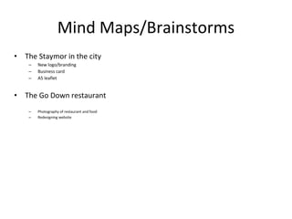 This document contains ideas and evaluations for branding projects for two clients: The Staymor hotel and The Go Down restaurant.