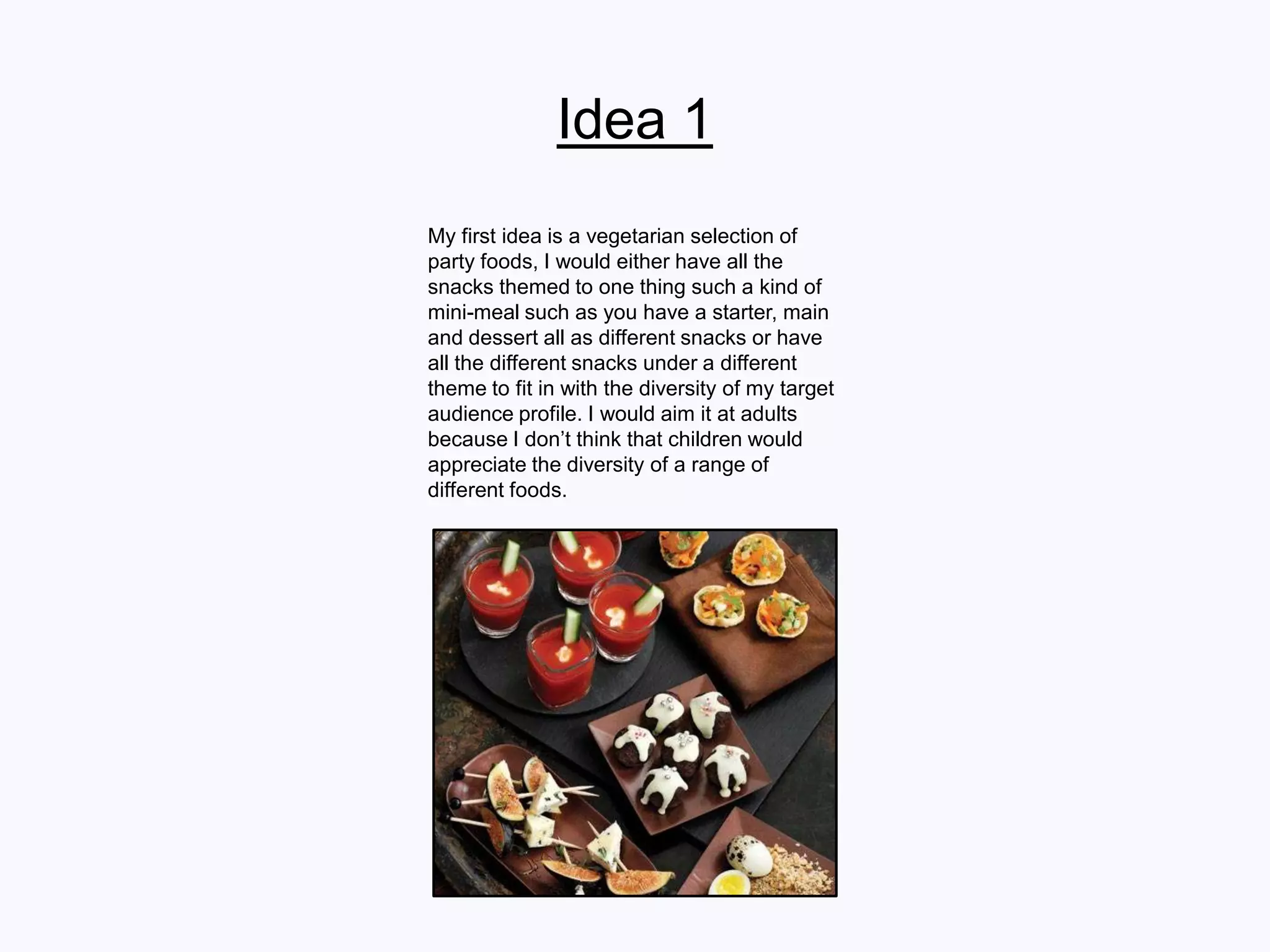 The final idea is to create a set of recipe cards with international themes. This was chosen because it allows for diversity in recipes to appeal to different tastes. It targets adults aged 18-35 who would appreciate diverse flavors. The recipes will be complex to challenge confident home cooks. The cards will have a laminated or glossy finish to look professional. Titles may be embossed. This idea was selected as it satisfies the brief of promoting vegetarianism through interesting recipes from around the world. The variety aims to find recipes people will enjoy to encourage vegetarian cooking and eating.