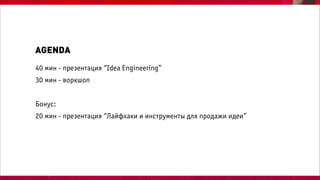 Документ описывает презентацию и воркшоп на тему 'idea engineering', проведенные Дарьей Мингалиевой, охватывающие темы коммуникационной стратегии, роли дизайна и пользовательского опыта. Воркшоп включает методы креативного мышления и инструментов для продажи идей, а также предлагает практические советы по визуализации и прототипированию. Также рассматриваются различные аспекты брендинга и методологии разработки, направленные на улучшение пользовательского опыта.