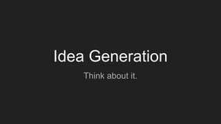 This document provides guidance on generating new ideas and evaluating ideas. It discusses techniques for idea generation such as improving existing ideas, combining ideas, and mind mapping. Activities are suggested for observing challenges, applying "How might we" questions, and discussing ideas with others. Methods are presented for evaluating ideas through a decision matrix, asking 5 key questions, and giving a 1-minute elevator pitch. The goal is to help choose ideas that are worth pursuing and eliminating unfit ideas.