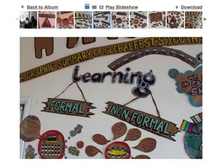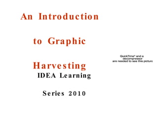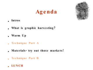 The document introduces graphic harvesting, highlighting its techniques for visually capturing key conversations in real-time through methods like graphic recording and facilitation. It provides an agenda for a learning series in 2010, featuring examples and exercises to practice these skills. Additionally, it includes online resources for further exploration and engagement in the practice of graphic harvesting.