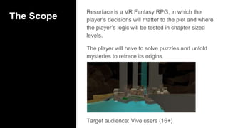 Resurface is a VR fantasy RPG set in the world of Ilara, which revolves around the four elements of Earth, Wind, Water, and Fire. Players take on the role of a creature composed of Crystal, Stone, and Void who is taught to control his elemental powers by his void companion Shade. The game will include puzzle-solving, combat, and a storyline that progresses through different areas including stone villages and city ruins. Developers aim to release a playable first level demo in March/April 2017 and complete the first full stage by mid-2018.