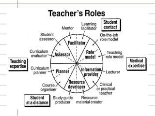 An ideal classroom environment provides sufficient facilities in good condition like tables, chairs, computers and air conditioning. The classroom setting should be well-organized and comfortable with enough space for all students. Teachers should use methods like PowerPoint lectures, encourage two-way communication, student participation, questions and answers, and group discussions. Resources like books, handouts and notes should be adequate and relevant. Assessments of student performance include presentations to boost confidence, research projects to encourage proactivity, weekly assignments to improve writing skills, and quizzes to assess understanding of covered topics. The teacher's role is to have good knowledge, deliver lessons fluently, be friendly, concerned for students, and serve as a good role model who motivates
