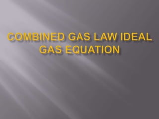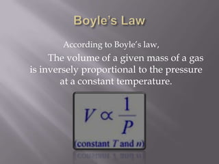 Boyle's law states that the volume of a gas is inversely proportional to its pressure when temperature is kept constant. Charles's law states that the volume of a gas is directly proportional to its temperature when pressure is kept constant. An ideal gas obeys both Boyle's law and Charles's law, such that its volume is directly proportional to temperature and inversely proportional to pressure, as expressed by the equation PV=nRT.