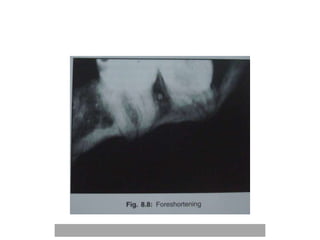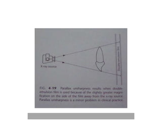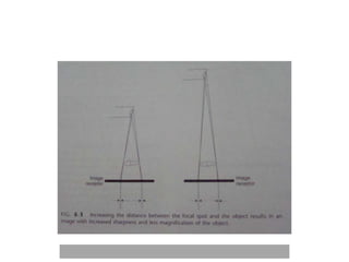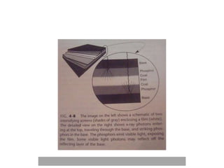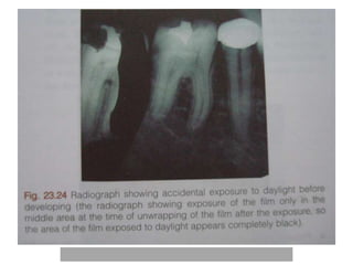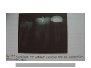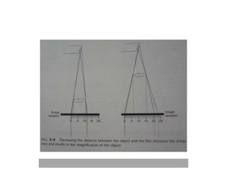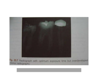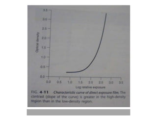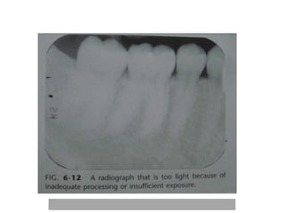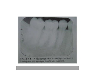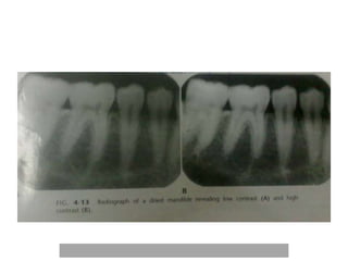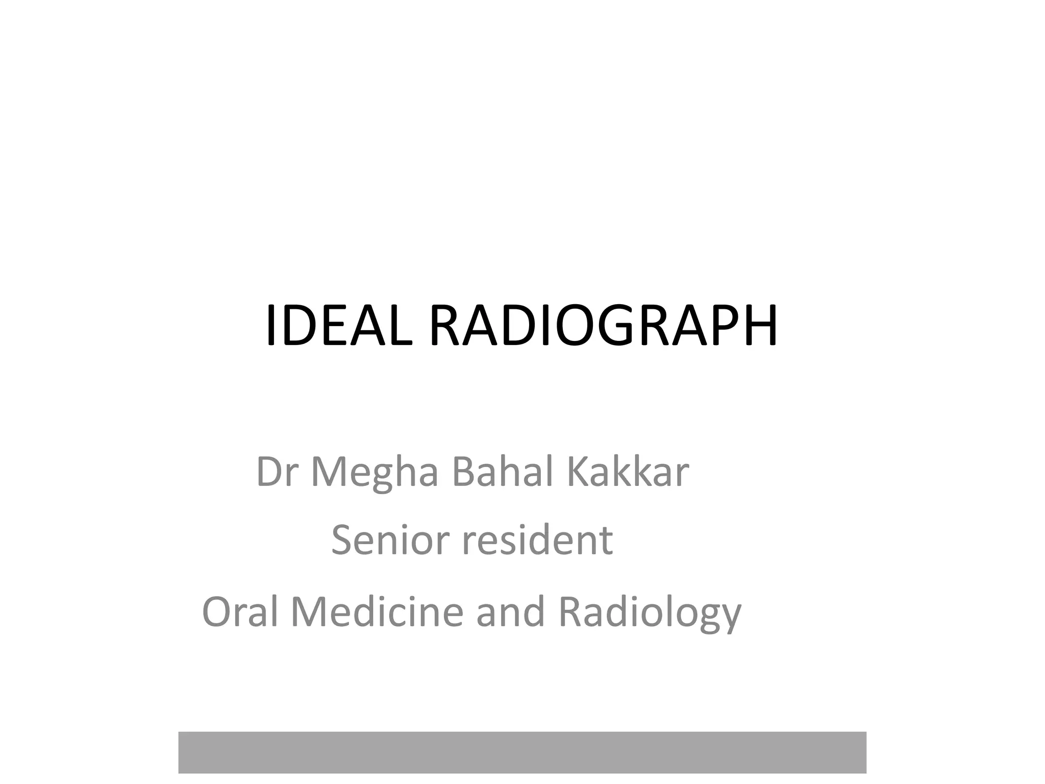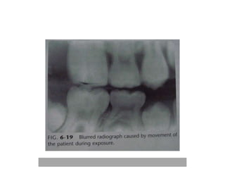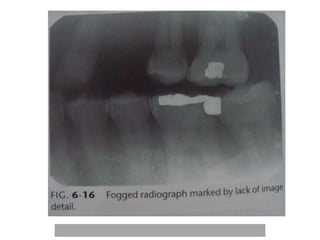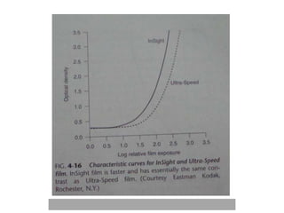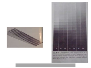 An ideal radiograph has the desired density and contrast to show details clearly without distortion. Several factors influence radiographic quality, including density, contrast, speed, latitude, noise, and blurring. Density depends on exposure, subject thickness, and composition. Contrast is affected by subject contrast, film contrast, and scattered radiation. Film speed indicates the exposure needed to achieve a standard density. Latitude refers to the range of densities a film can record. Noise and blurring degrade image quality. Overall image quality results from the combination of these technical characteristics.