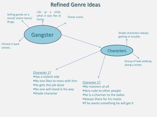 This document discusses ideas for a gangster genre film, including possible characters, settings, target audience, and basic information. It describes two main characters - one who is violent and intimidating, and another who is rude and charms women. It also mentions filming chase scenes in back streets and exploring a character's childhood home life. The target audience is described as mainly men ages teens to 40s who enjoy streetwise and working class characters. Locations would likely be set in London with cockney accents, and involve drugs, alcohol, stolen goods, and trouble with the police.