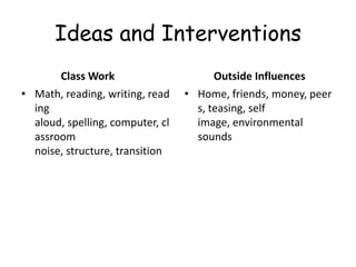 The document outlines various strategies and interventions to manage classroom behavior and enhance learning experiences for students. Key points include the importance of a structured environment, consistency among team members, and creative reinforcement techniques personalized to student preferences. It emphasizes the need for flexibility in approaches, recognizing that what works for one student may not work for another, and encourages long-term solutions over quick fixes.