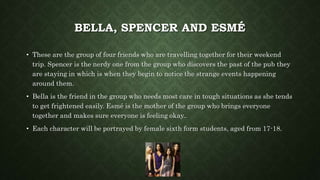 This document provides character descriptions for an upcoming student film project. It introduces the four main characters: Bella, Spencer, and Esmé, who are friends traveling together for a weekend trip, and Damon, the grandson of the pub owner whose dark family history becomes entangled with the friends. It also notes which sixth form and university students will portray each role to best capture the dynamics of friendship among the friends and an unsettling quality in Damon.