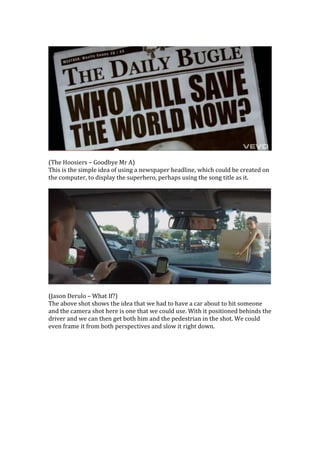 The document provides examples of shots and ideas that could be used to create music videos with comic book-inspired elements. These include using "Pow" signs to depict stunts without actual contact, costumes and settings to establish a superhero's lair, and newspaper headlines displaying the superhero and song title. Another proposed shot involves framing a car accident from the driver and pedestrian perspectives to build tension. Additional ideas are foot-tapping and pencil-drumming as intro beats set in a college scene. One shot reflects a theory of hyper-reality by including surreal elements to draw in the audience for a video set in a superhero's daydream.