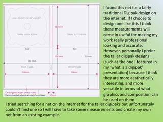 The document discusses ideas for designing a DVD digipak. It includes measurements found online for a traditional digipak design. The author prefers taller designs that allow more versatile graphics. Examples of indie album covers are shown that use simple black and white designs with mirror images or just the band name. Sketches are provided of possible front and back layouts, with the middle design liked best for the front and bottom for the back.