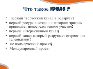 Ideas TV - это первый творческий и интерактивный телеканал в Беларуси, созданный для активной молодежи, которая хочет участвовать в его развитии. Канал направлен на распространение позитивной информации и развитие культурного кругозора зрителей, предлагая разнообразный медиаконтент и сотрудничество с творческими коллективами. Целевая аудитория включает энергичных и креативных людей, готовых к взаимодействию через интерактивные форматы.