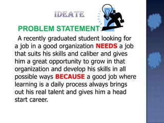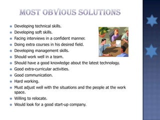A recently graduated student is seeking a job that matches their skills and allows them to continuously learn and develop new abilities. To achieve this, the document recommends preparing for interviews, developing both technical and soft skills through additional training courses, staying up-to-date on the latest technologies, participating in extracurricular activities, and actively applying to positions at growing companies through various methods like job portals and campus recruitment. It also emphasizes the importance of self-improvement through skills workshops and professional development.