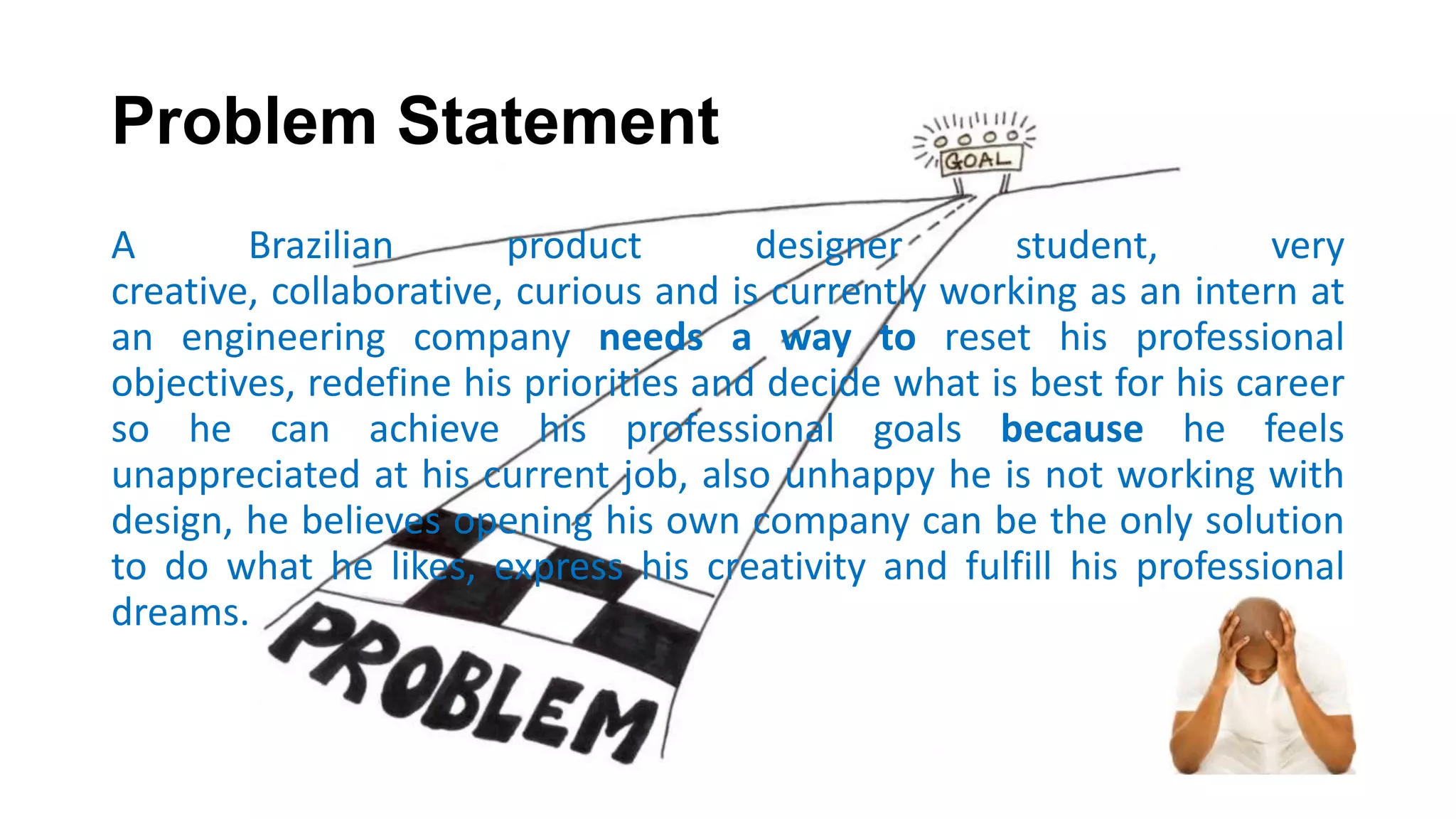 1) The document describes a Brazilian product designer student who is currently interning at an engineering company but feels unappreciated in his current role as he is not able to work on design projects.