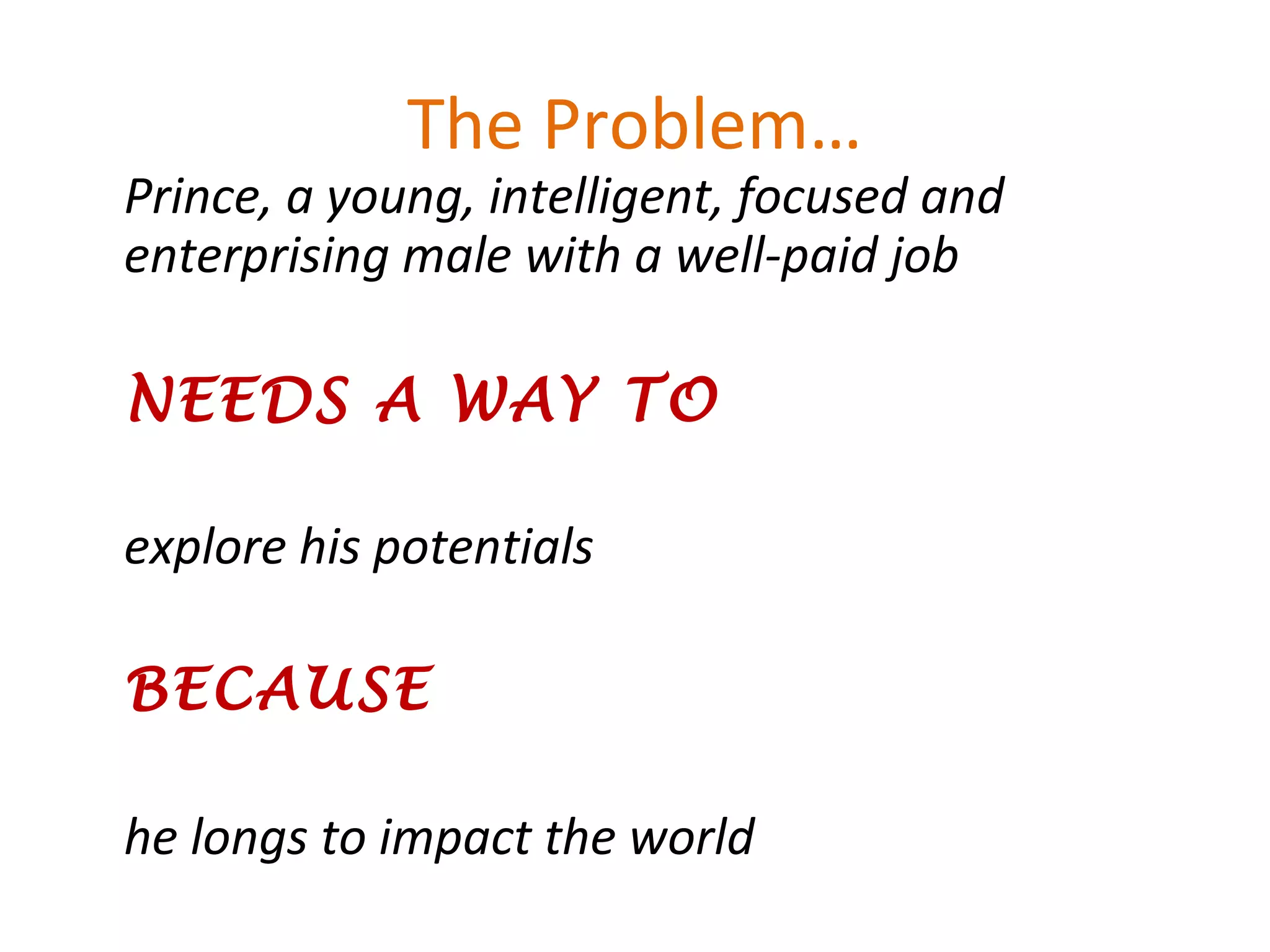 Prince wants to find a way to explore his potentials and impact the world. He feels his current job does not allow this. The document provides many ideas for Prince, including gaining more education, finding problems to solve, volunteering in areas of interest, and taking personality tests to identify his strengths. The most practical ideas are to get work experience in different areas of interest and qualifications related to those areas. The most disruptive idea is to choose a problem to solve and work to find an innovative solution. The author's favorite idea is to instantly place Prince in his perfect future situation.