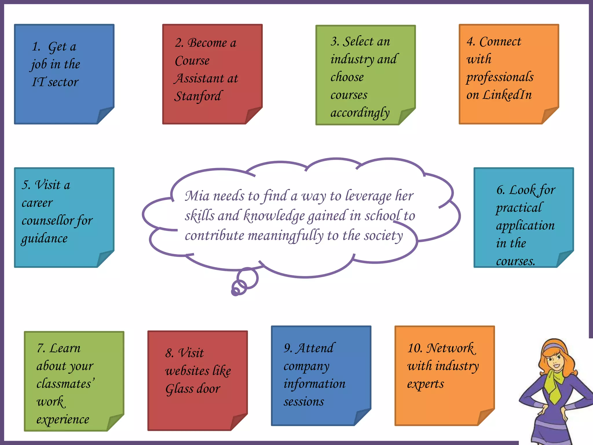 The document provides 50 suggestions for ways that Mia can leverage her skills and knowledge gained in school to contribute meaningfully to society. The most practical suggestion is to network with industry professionals to get a sense of what different jobs entail and how they impact society. The most disruptive suggestion is for Mia to go back to her native country to work at the grassroots level and make a direct impact in socio-economic areas needing attention. The author's favorite suggestion is for Mia to tutor students through the office of accessible education, as they believe in the power of education to change lives.