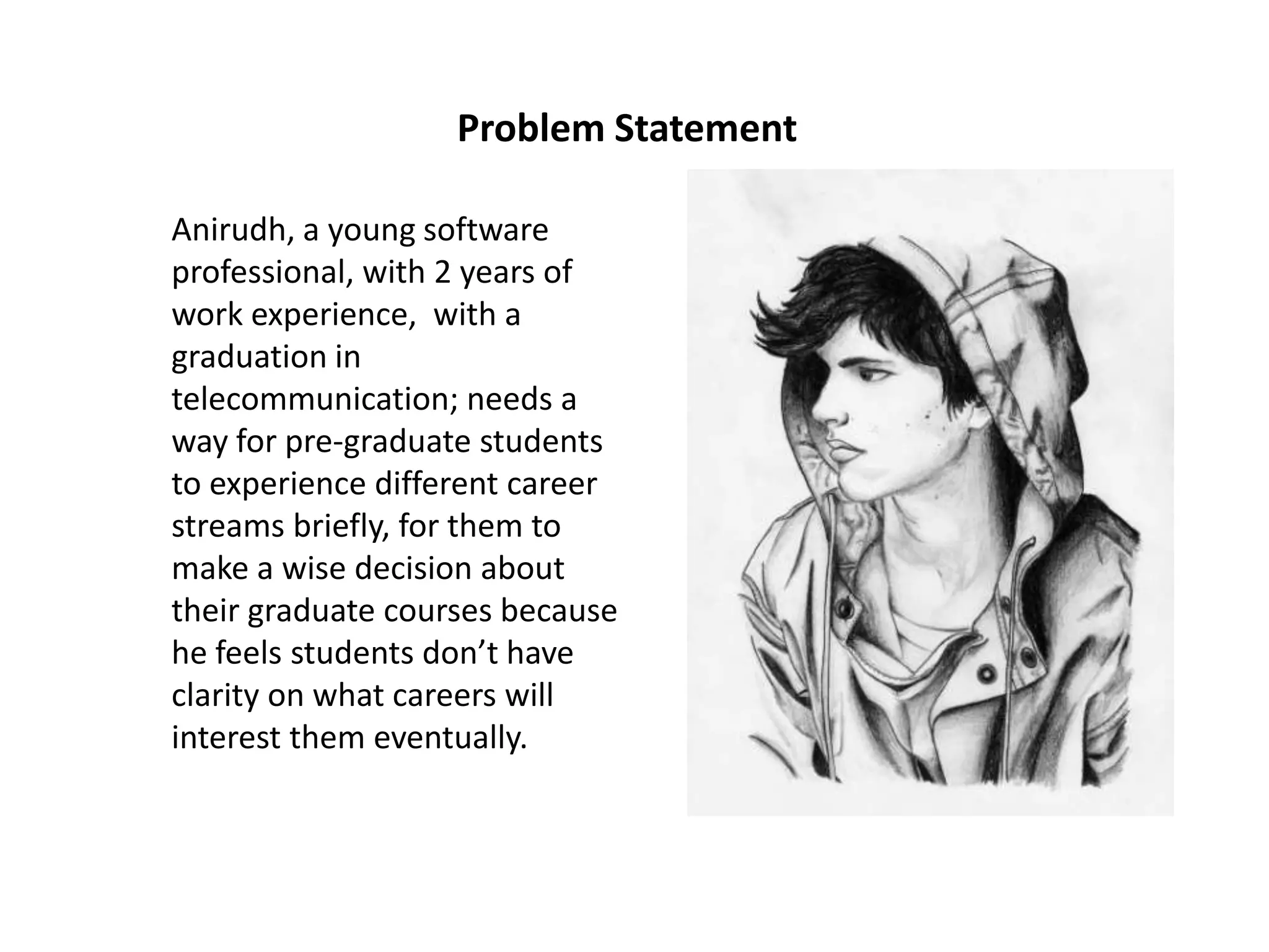 Anirudh, a software professional with 2 years of experience, proposes ideas to help pre-graduate students explore different career options so they can choose their graduate studies wisely. Some ideas include industry experts visiting colleges, internships, and intensive industry courses. The "Most Practical Idea" is for companies to have their own online academies where students can learn about the company, take analytical tests to discover career interests, and train for jobs through online courses and interactions with professionals. The "Favorite Idea" is "Customized Graduation Degrees" where students experience different industries and tailor their own degree based on the courses needed for their preferred jobs. The "Disruptive Idea" is for students to join an