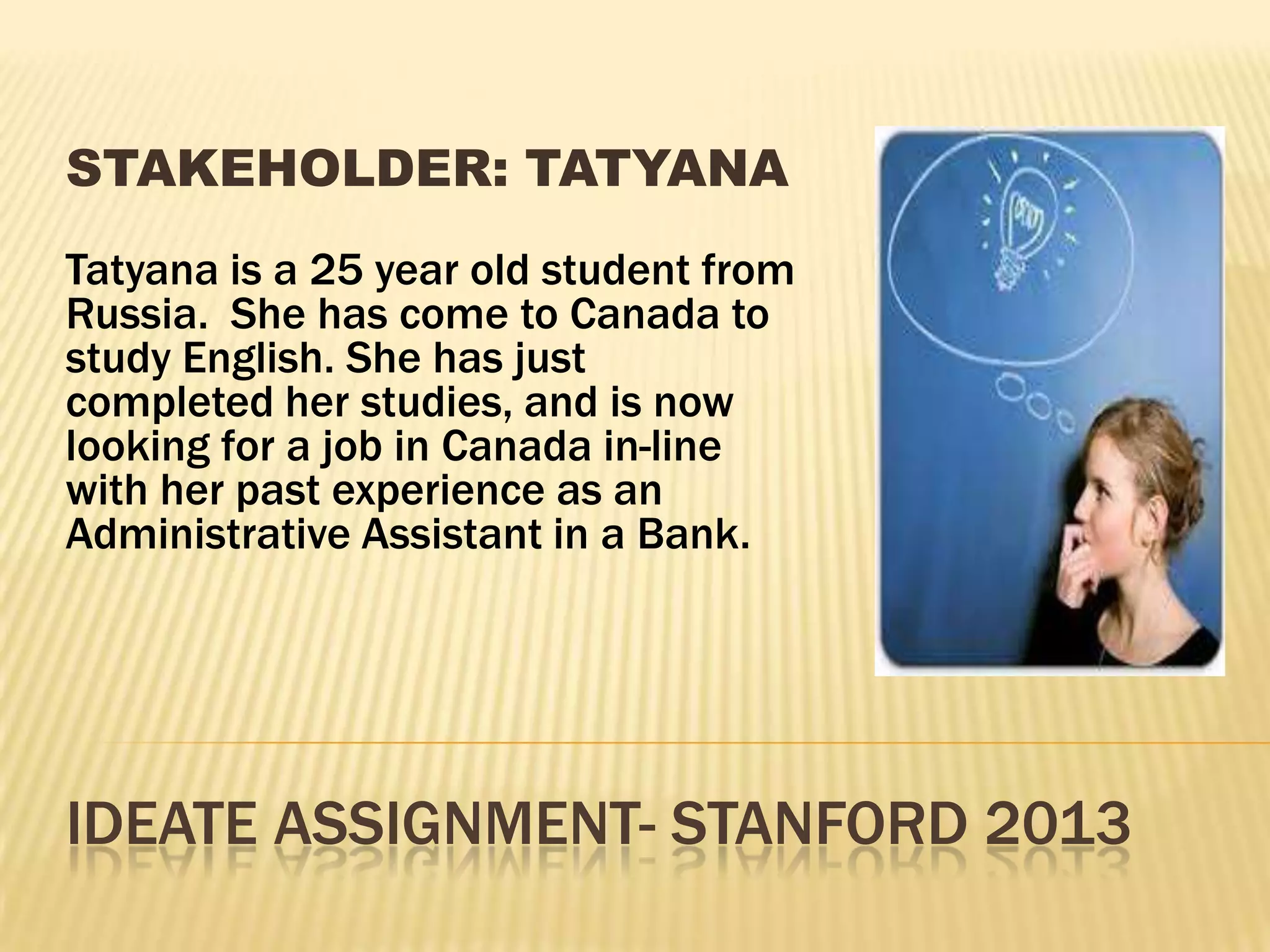 The document focuses on Tatyana, a 25-year-old Russian student in Canada seeking to improve her English and secure employment. It outlines various ideas for her, including enhancing her language skills, expanding her network, exploring job markets in the USA and Mexico, and considering internships or volunteer work. The selected ideas emphasize the importance of language fluency, social connections, and broader cultural experiences in achieving her goals.