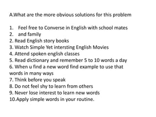 The document discusses potential solutions to address a 10th grade student's lag in English communication skills in Chennai, India. It provides lists of solutions under categories of initial obvious solutions, ways to modify the initial solutions, solutions with an unlimited budget, free solutions, and solutions if controlling the laws of nature. The best three ideas selected are to converse continuously in English with friends and family to facilitate learning through practice and feedback, read English books to build vocabulary, and think before speaking to communicate more effectively through empathy.