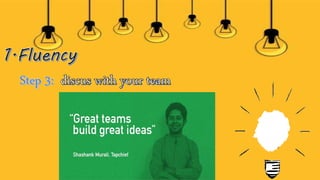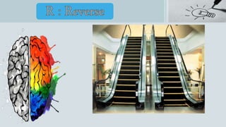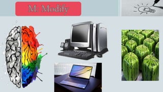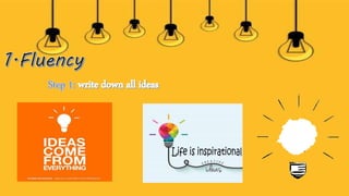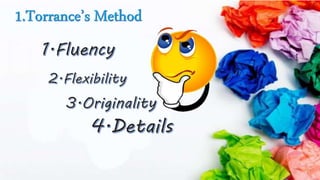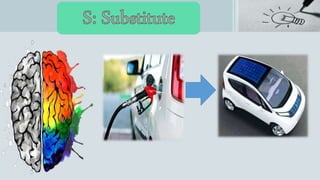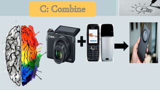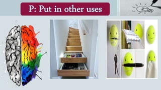 The document discusses ideation, which is the process of generating and developing new ideas. It provides two common methods for ideation: Torrance's method and SCAMPER method. The SCAMPER method involves combining, adapting, modifying, putting to other uses, eliminating, reversing, and substituting to come up with new ideas. The document also lists several references for learning more about ideation techniques and processes.
