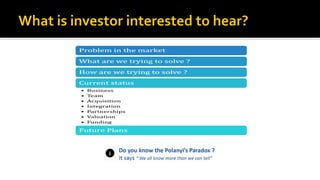 This document provides guidance for creating an effective presentation for a startup business seeking incubation. It outlines 11 slides that should be included to cover key aspects of the business such as the company name, core team, customer needs, market size, value proposition, product details, business model, competition, financials, reasons for seeking incubation, and the 9 essential elements of a business model canvas. An example of an education-focused nonprofit startup is also provided. The presentation aims to clearly convey all relevant information about the business concept to assess its viability and fit for an incubator program.