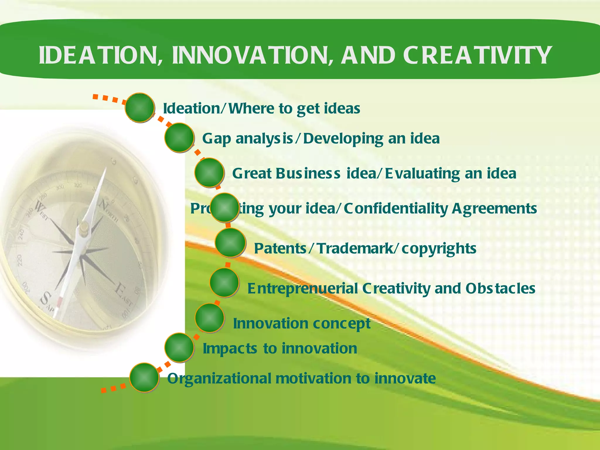 The document discusses ideation, innovation, creativity, and protecting ideas. It provides information on where to get ideas, developing ideas, evaluating ideas, and obstacles to innovation. Organizational motivation and creativity components are also covered. Examples of patents, trademarks, and copyrights are given to explain how to protect different types of ideas.