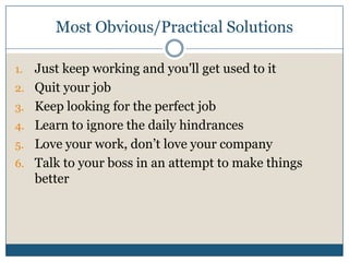 Marium is a recent graduate who is hardworking but finds it difficult to adjust to workplace norms while maintaining her passion for helping people. The document provides various ideas for how Marium could approach this problem from different perspectives, including practical solutions, how a child might solve it, solutions with an unlimited budget, creative or "geeky" ideas, and evaluates the best ideas. The most practical solution is to continue working and adjust over time, while organizing self-help groups for employees and employers could result in significant changes to workplace culture. Starting online and offline discussion groups is the assistant's favorite idea to help young workers cope with stress.