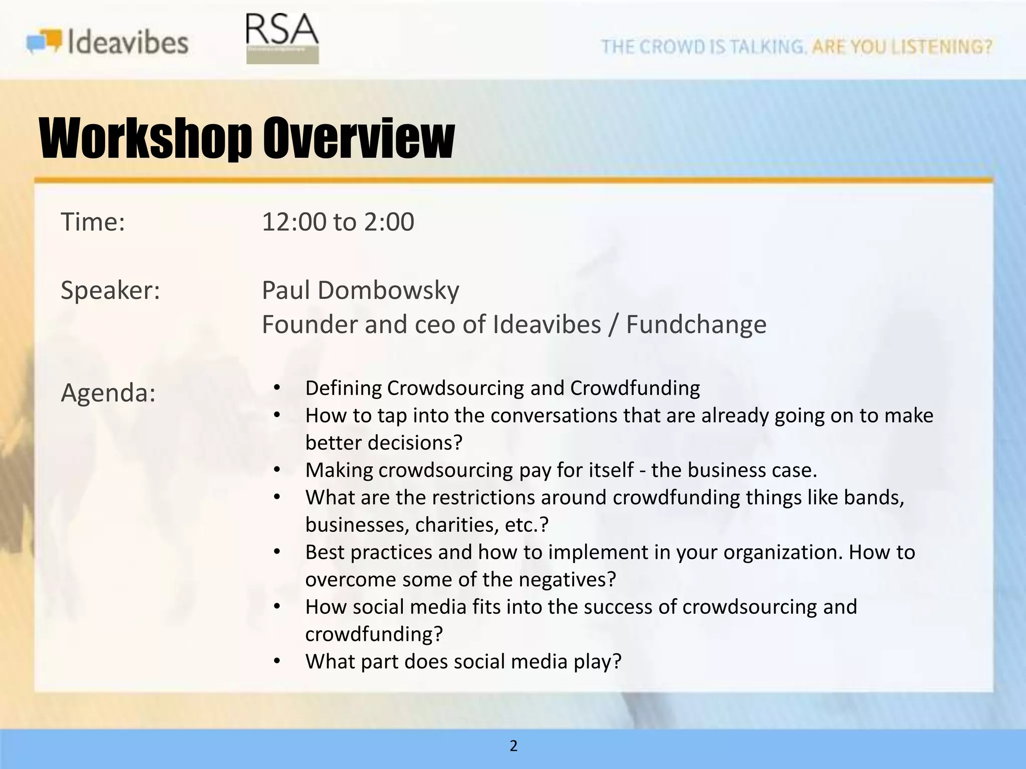 The workshop led by Paul Dombowsky explores the concepts of crowdsourcing and crowdfunding, emphasizing their definitions, business cases, and best practices for implementation. It discusses how organizations can leverage social media to engage their communities for innovative ideas and funding initiatives, highlighting successful examples and the changing landscape of donor demographics. Additionally, it addresses the importance of strategic management in recruiting and maintaining a supportive crowd for crowdfunding efforts.
