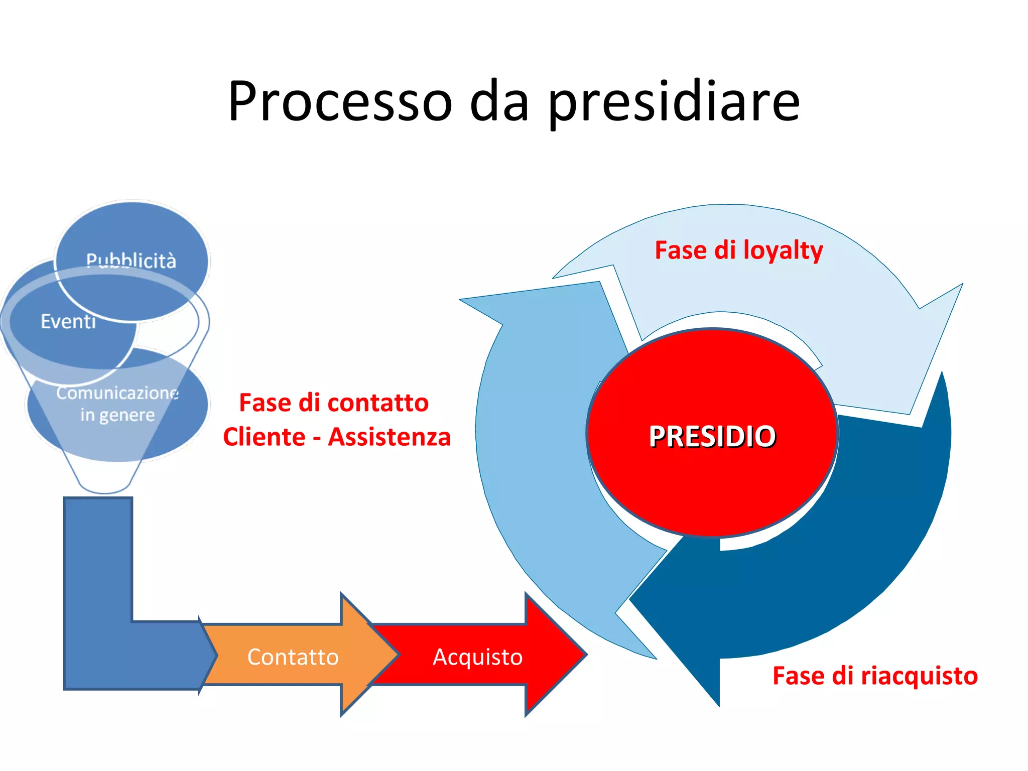 Il documento descrive il processo di contatto con i clienti durante le fasi di acquisto, loyalty e riacquisto. Viene menzionato l'importanza della gestione dei database per le vendite nuove e usate, nonché per il post-vendita. Si evidenziano anche attività come visite in salone, test drive e eventi.