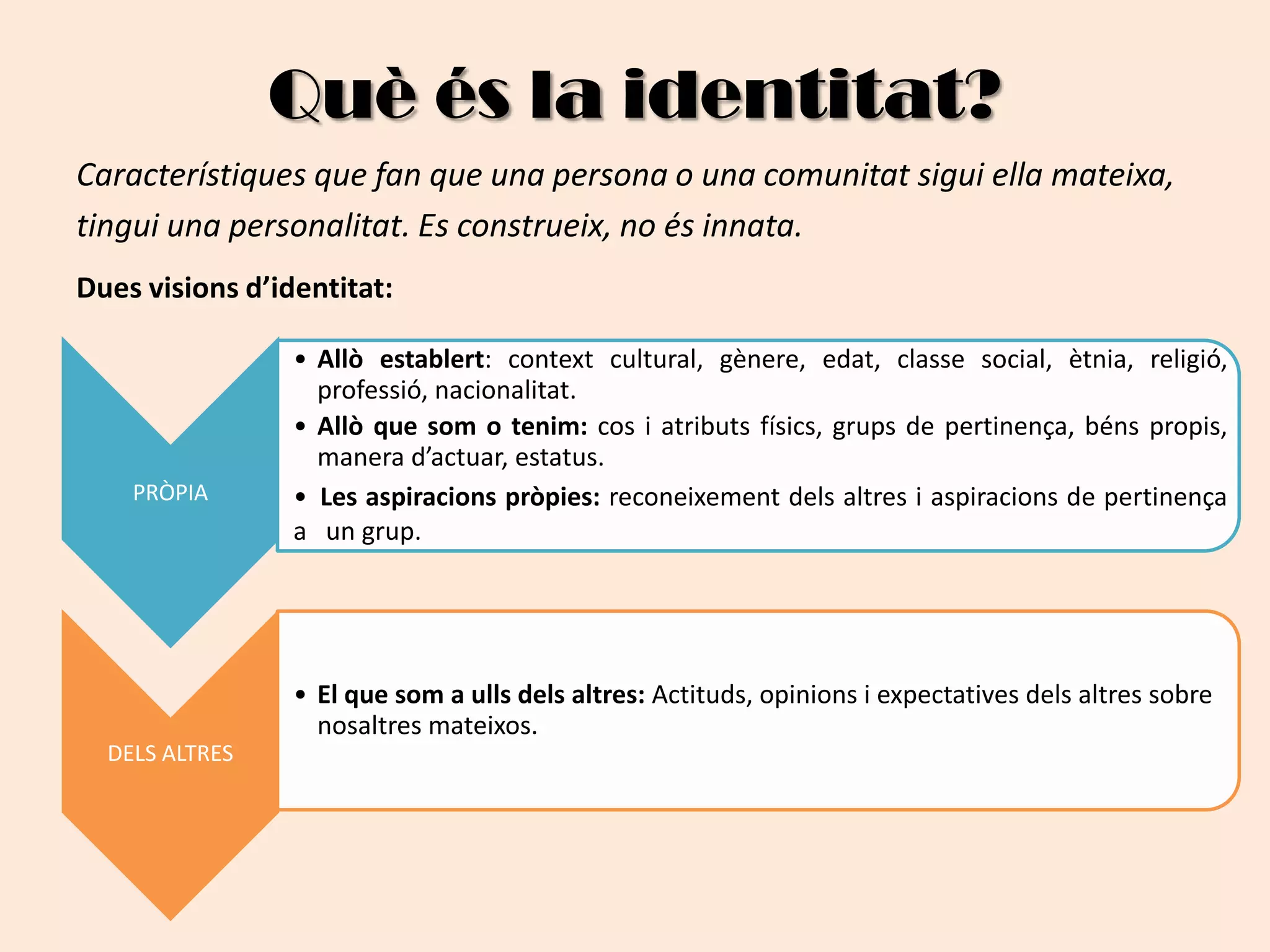 Quèés la identitat?Característiquesque fan que una persona o una comunitat sigui ella mateixa,tingui una personalitat. Es construeix, no és innata.Dues visions d’identitat: