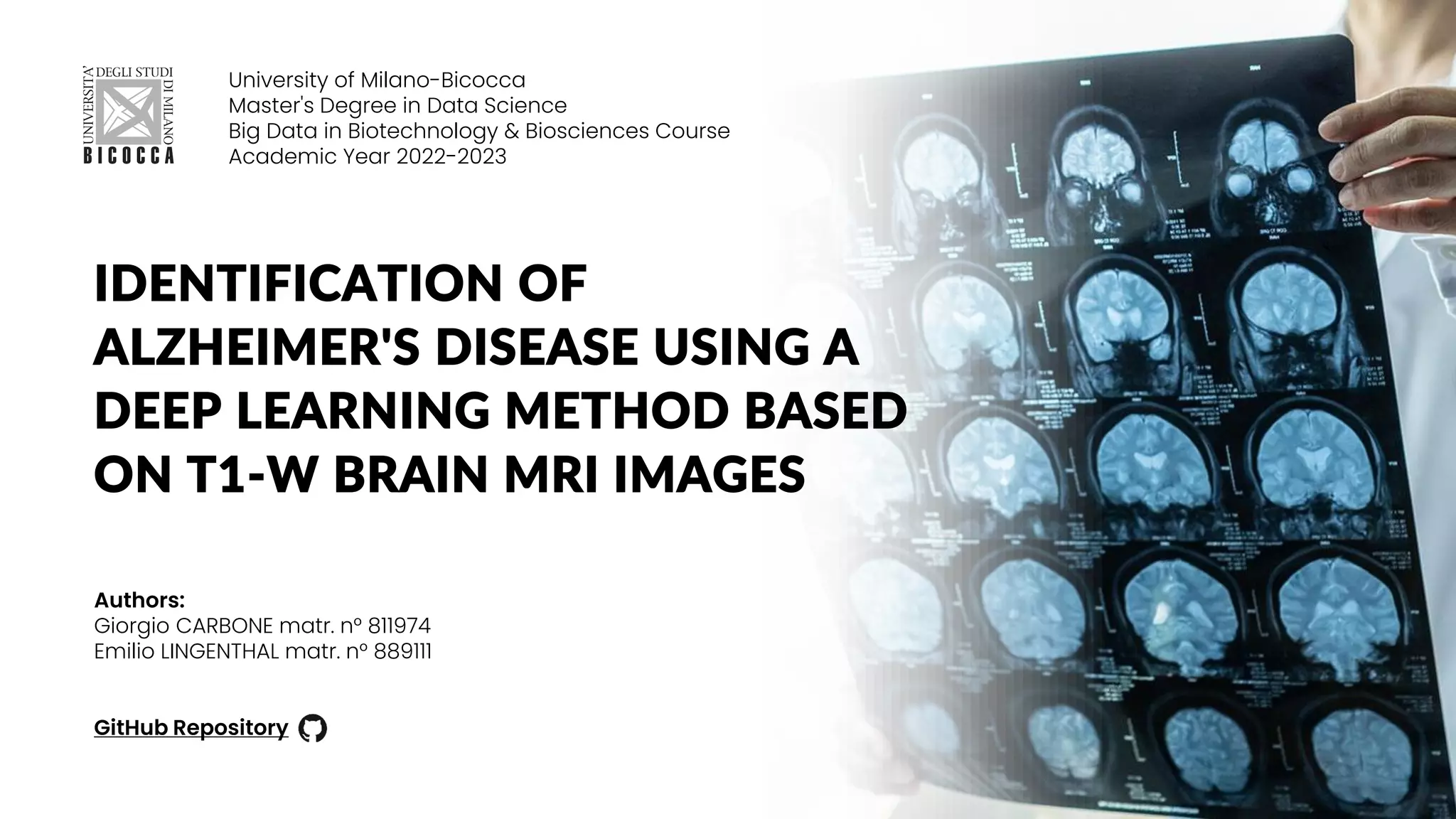 The document discusses a study that aimed to classify Alzheimer's disease using deep learning on T1-weighted brain MRI images. Specifically, it sought to 1) build a dataset from the ADNI database combining MRI images with clinical data, 2) train a deep neural network to classify images as Cognitive Normal or Alzheimer's, and 3) evaluate techniques for addressing class imbalance. The researchers explored the ADNI data, finding correlations between diagnostic labels and attributes. They then trained a ResNet model for binary classification but faced class imbalance issues given the rarity of Alzheimer's cases. To address this, they evaluated random and stratified undersampling of the majority class as well as oversampling the minority class using a WGAN-GP for synthetic image generation.