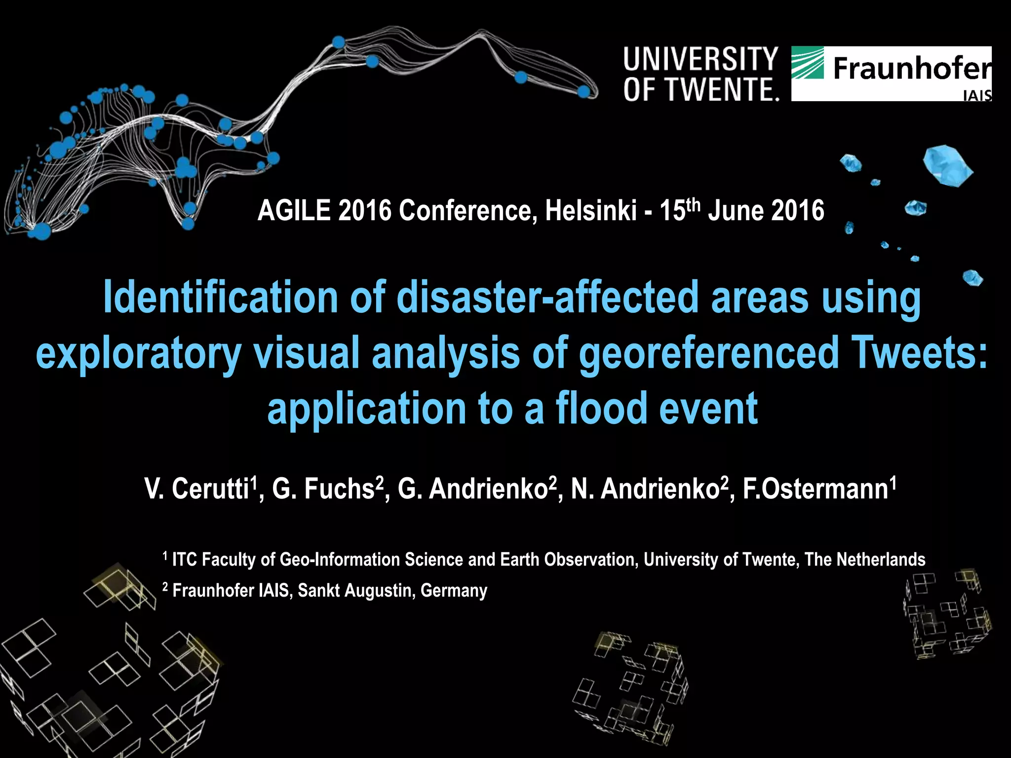 The document discusses a presentation from the Agile 2016 Conference on using georeferenced tweets for identifying disaster-affected areas, specifically during a flood event in Sardinia in November 2013. It outlines methods of data preprocessing, clustering techniques, and visual analysis to assess the spatio-temporal footprint of the disaster, emphasizing the integration of data mining and visual analytics. The conclusions highlight the initial steps towards defining the geospatial impact of floods through social media, with suggestions for further evaluation and improvements.