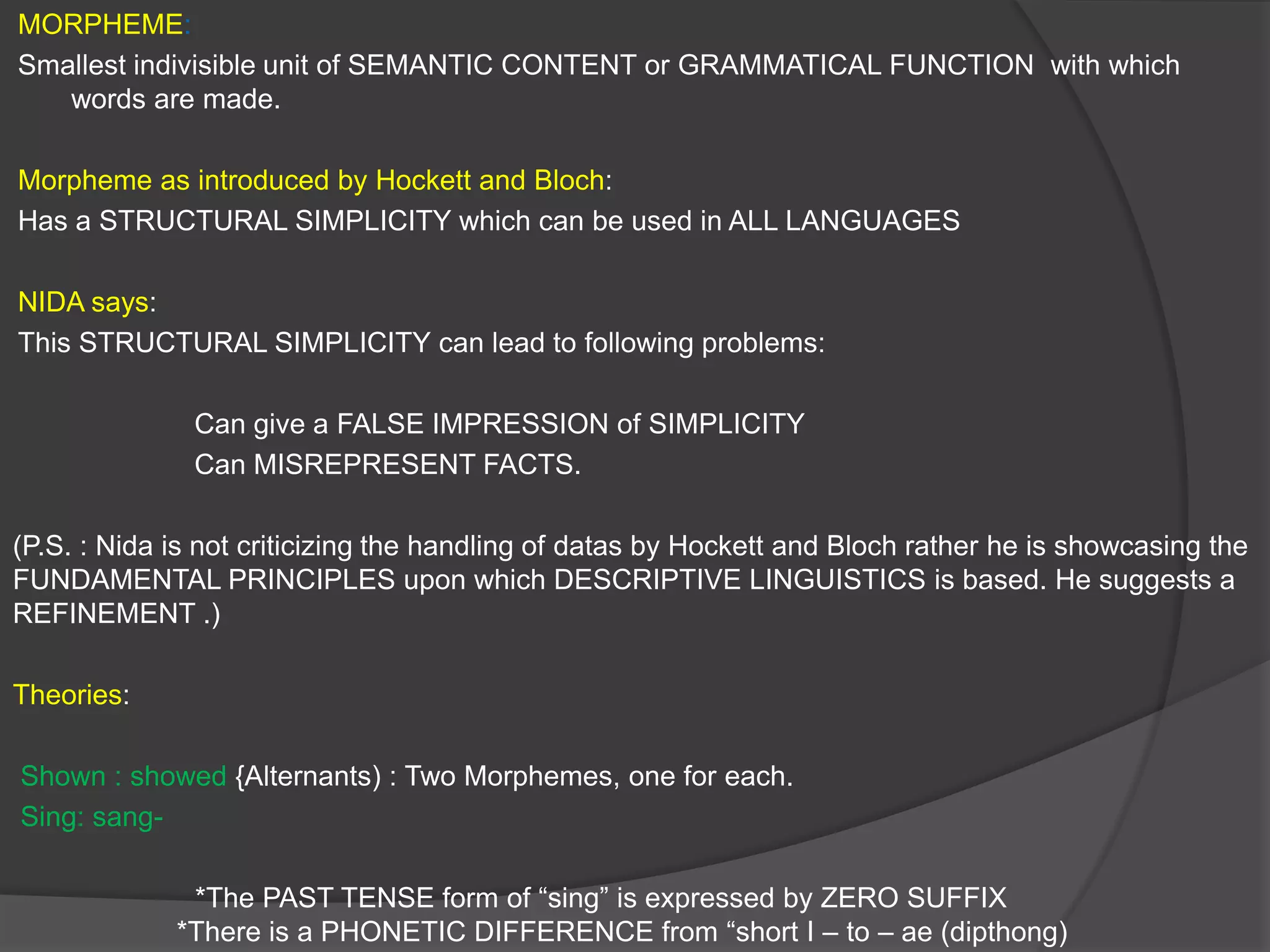 The document discusses the concept of morphemes as the smallest units of meaning or grammatical function, citing the works of linguists like Hockett and Bloch. It explores various theories, types of morphemes, their phonological and semantic distinctions, and provides examples of their complexities in language. Additionally, it highlights challenges in defining morphemes and presents theoretical principles to understand their relationships and variations across different languages.