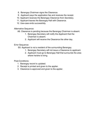 This document outlines the process for applying for a Barangay Clearance in the Philippines. It describes the actors involved, including the applicant and barangay secretary and chairman. The main steps are for the applicant to obtain an application from the barangay secretary, fill it out along with attaching requirements, and submit it. The secretary then verifies the application and presents it to the chairman for signature before the applicant receives the clearance upon payment of fees. Exceptions involve the chairman being absent or the applicant not residing in the barangay.