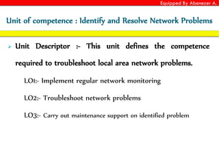 This document discusses network monitoring tools and techniques. It defines network monitoring as the process of collecting network activity statistics to inform management decisions. Regular monitoring is needed to troubleshoot problems, identify slow or failing components, and notify administrators of outages. Common diagnostic tools discussed include Ping, Traceroute, Ipconfig and Netstat which can test connectivity and determine device availability. The document also outlines some network monitoring platforms and utilities that can perform specialized tasks like protocol analysis, connectivity testing and log analysis.