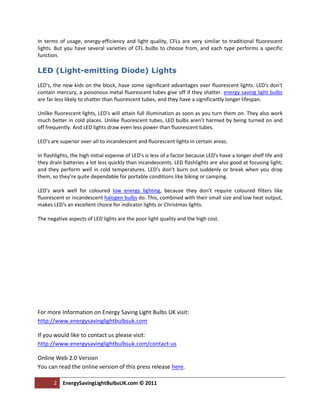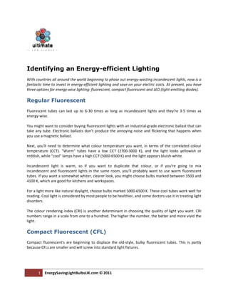 The document discusses three main options for energy-efficient lighting: fluorescent lights, compact fluorescent lights (CFLs), and light-emitting diode (LED) lights. Fluorescent lights last much longer than incandescent bulbs and use less energy. CFLs are smaller than fluorescent tubes and can fit in standard light fixtures. LED lights have the longest lifespan, use the least amount of energy, and don't contain mercury like fluorescent bulbs. However, LEDs currently have higher upfront costs and produce lower quality light than other options.