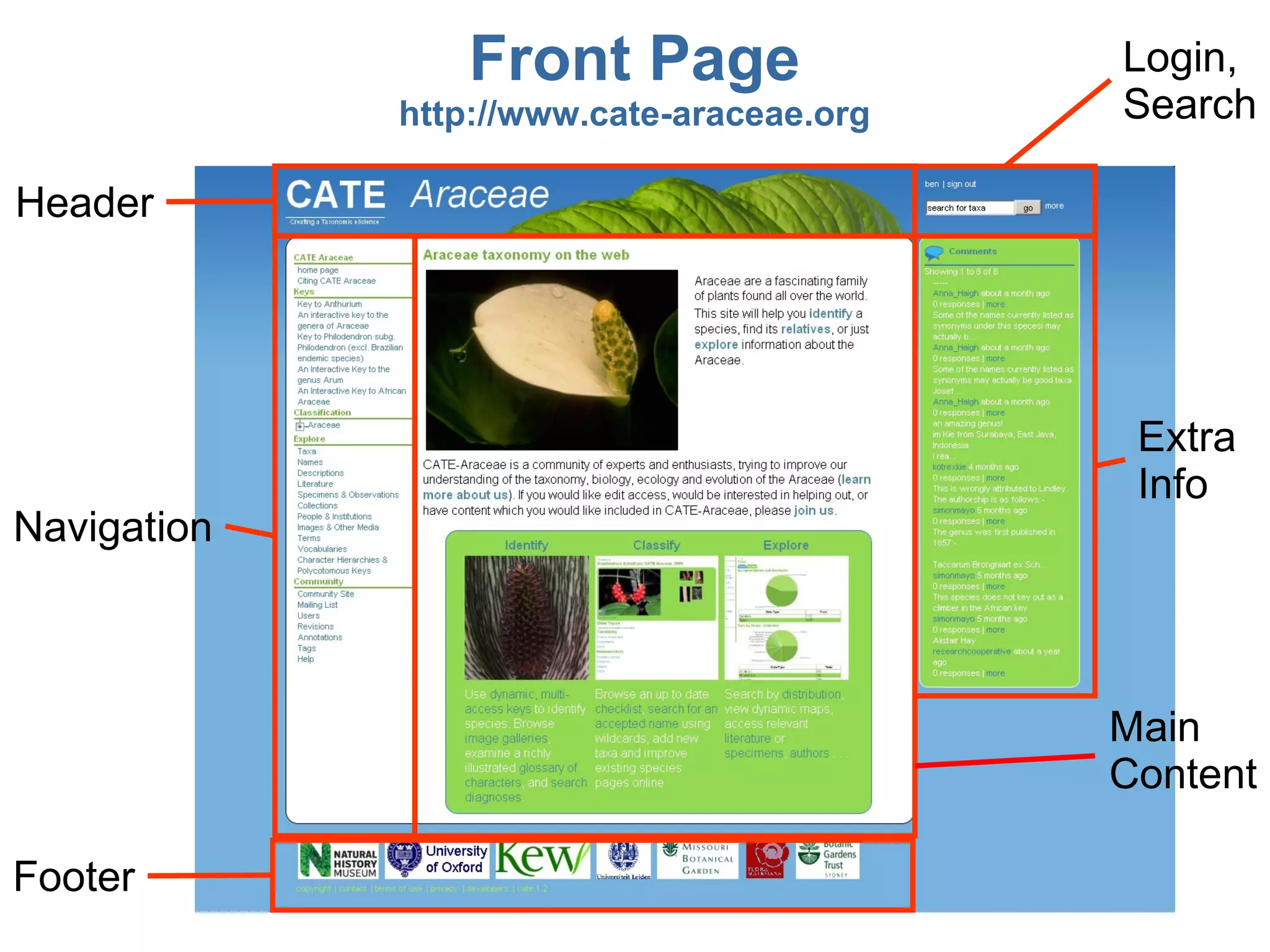 The document outlines how to identify aroids online using the CATE Araceae platform. It provides step-by-step instructions on accessing and utilizing taxonomic keys, species pages, and additional resources. Each species page offers information such as names, references, images, maps, and distribution details.