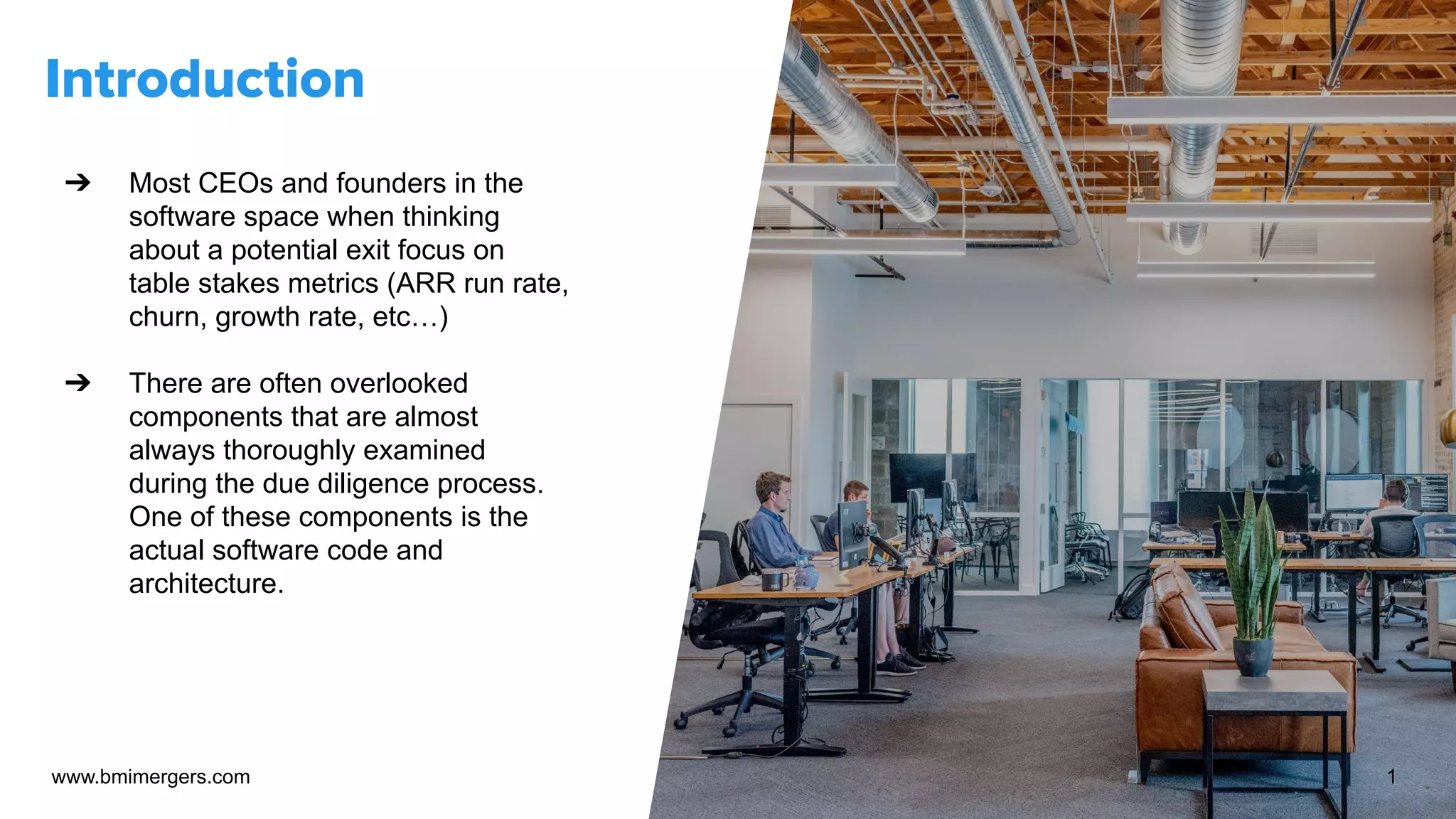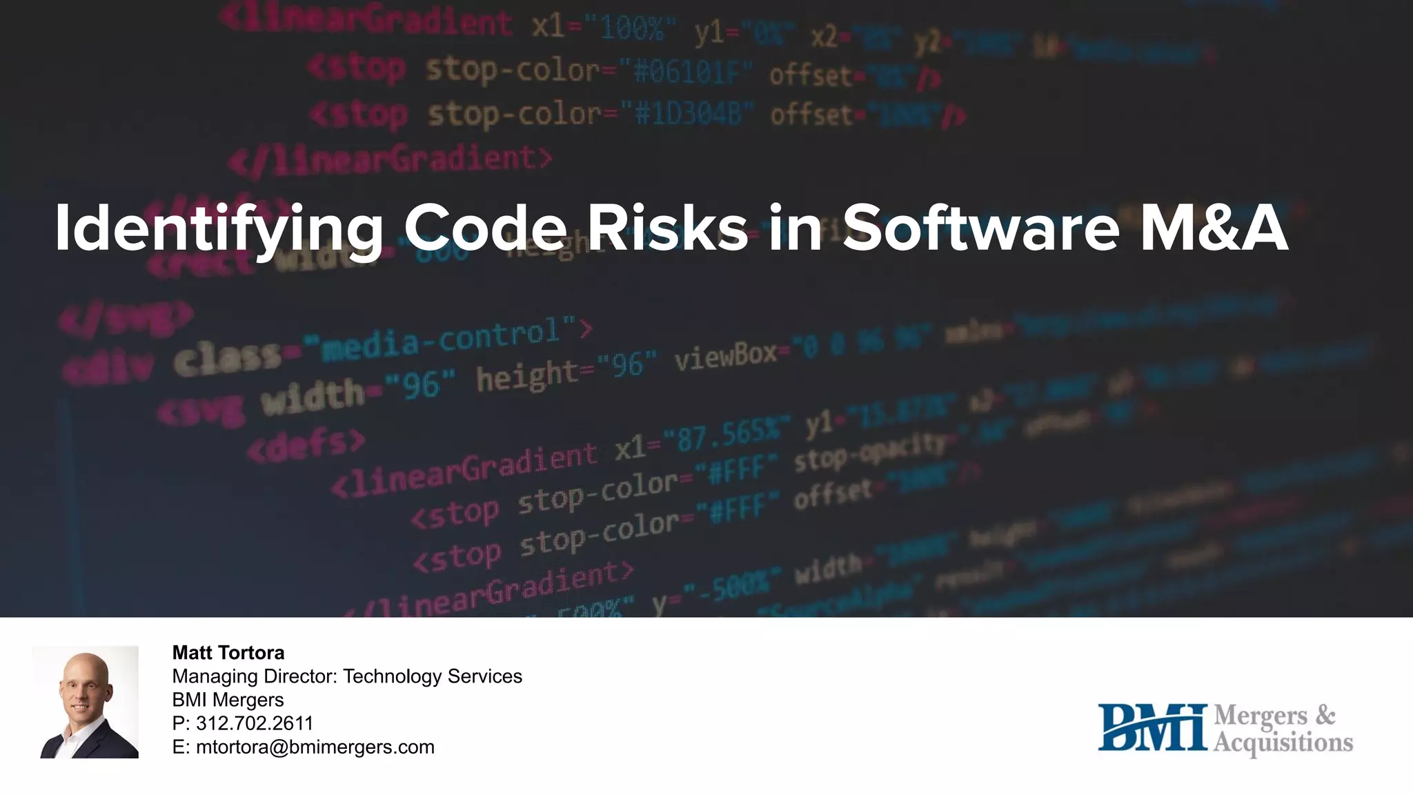 The document discusses the critical importance of assessing software code and architecture during the mergers and acquisitions (M&A) process in the technology sector. It emphasizes the potential risks associated with poorly written source code, technical debt, and open-source software that can affect the acquirer's decision. Additionally, it highlights the necessity of conducting thorough technical audits and penetration tests to uncover vulnerabilities and ensure proper preparation for a successful acquisition.