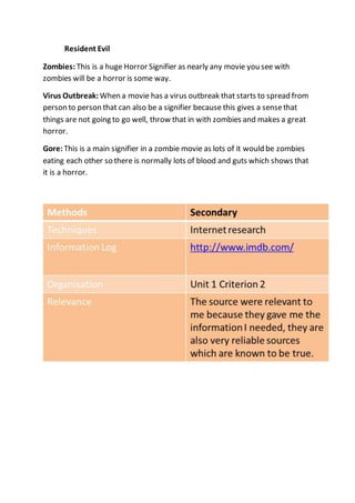 Cameras filming empty rooms, the presence of children, and the use of night vision are identified as common genre signifiers that signify a paranormal or ghost movie in the trailer for Paranormal Activity 2. For The Texas Chainsaw Massacre, the key signifiers mentioned are the presence of a psychopathic antagonist, their use of a chainsaw as a weapon, and scenes of gruesome violence and blood. Resident Evil is identified as having clear horror signifiers through the inclusion of zombies, an outbreak of a spreading virus, and depictions of gore.