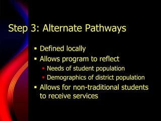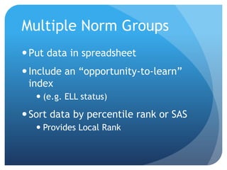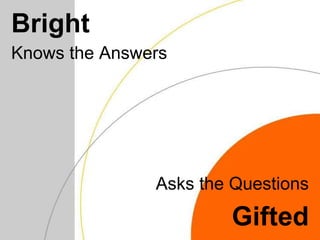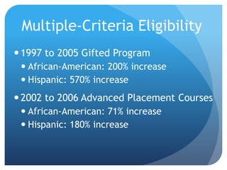 This document discusses identifying gifted and talented students. It begins with definitions of giftedness and different models for conceptualizing giftedness. It then discusses characteristics commonly seen in gifted individuals, both positive traits like curiosity and rapid learning as well as potential negatives like uneven development. The document emphasizes using identification procedures that are inclusive and reflect the diversity of the student population. It recommends using multiple criteria and sources of data in identification to avoid unfairly excluding certain groups. The goals of identification should be to select students who would benefit from supplementary services and to label the services not the students.